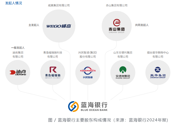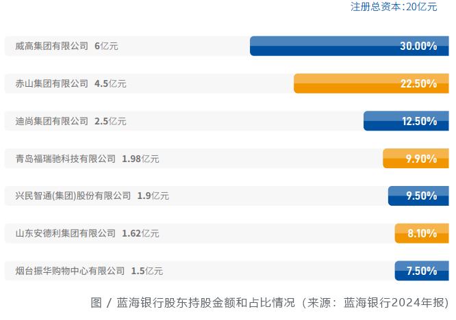 从股权结构来看,该行显著特色是由产业资本发起设立,主要股东为威高集团、赤山集团、迪尚集团等7家山东本地民营企业,注册资本20亿元。