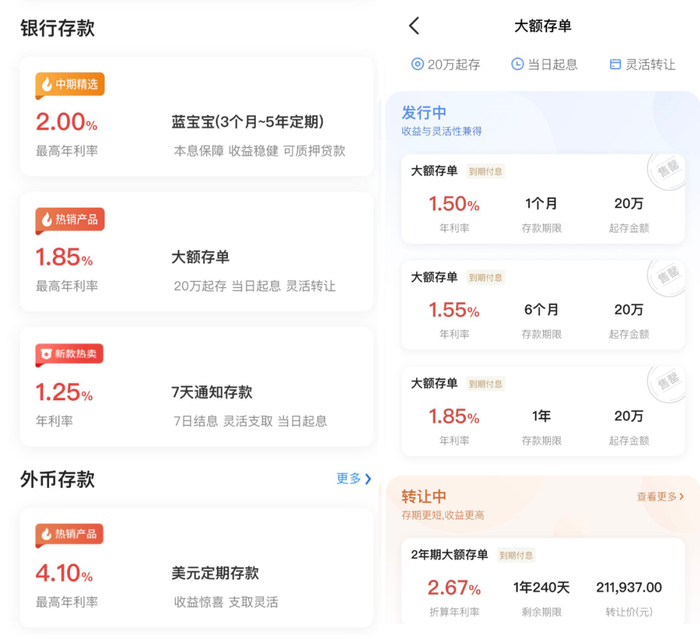 截至7月初,该行1年起以内的大额存单产品均为告罄状态,2年期及以上大额存单产品显示为转让中。