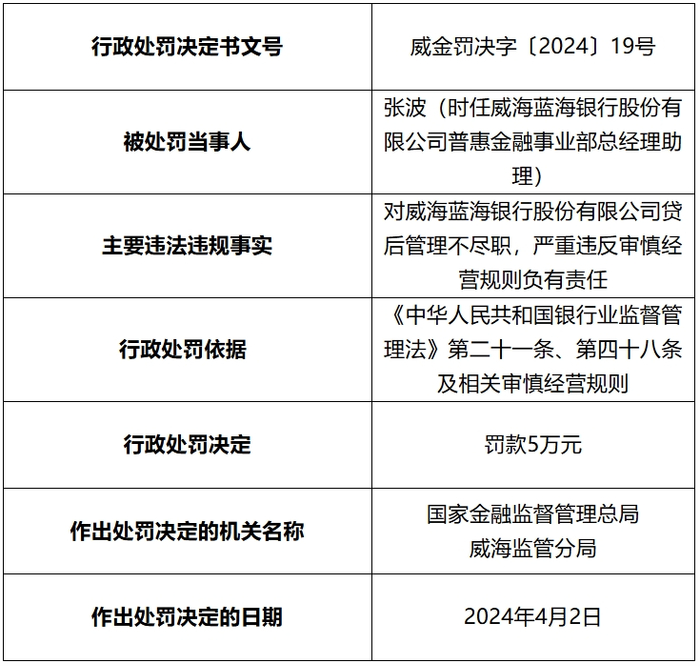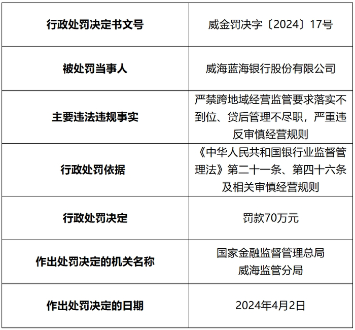 图 / 蓝海银行2024年4月有关跨区域个人经营贷的三个罚单(来源:人民银行山东省分行网站)