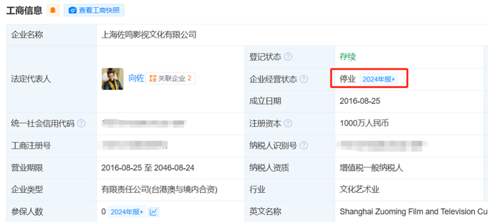 其中,上海佐鸣影视文化有限公司成立于2016年8月,注册资本1000万元人民币,向佐担任该公司董事长、法定代表人,持股70%,目前该公司虽存续,但已为停业状态。