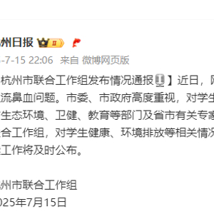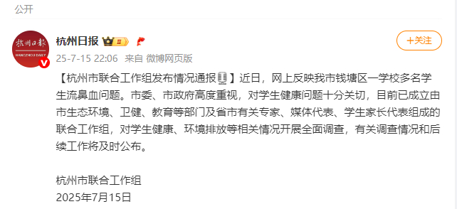据杭州市联合工作组7月15日通报,近日,网上反映杭州市钱塘区一学校多名学生流鼻血问题。市委、市政府高度重视,对学生健康问题十分关切,目前已成立由市生态环境、卫健、教育等部门及省市有关专家、媒体代表、学生家长代表组成的联合工作组,对学生健康、环境排放等相关情况开展全面调查,有关调查情况和后续工作将及时公布。