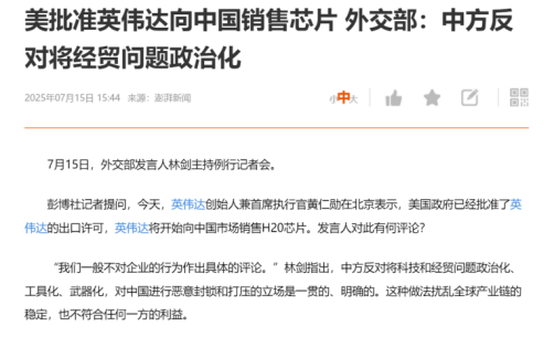 接着昨天在接受央视采访的时候突然宣布,美国政府已经批准英伟达的出口许可,英伟达将开始向中国销售H20AI芯片。