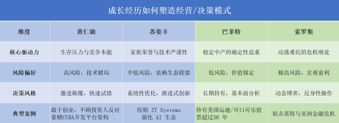 黄仁勋的冒险来自生存竞争的烙印;苏姿丰的严谨源于精英教育的规训;巴菲特的保守植根于中产阶层的安全感;索罗斯的激进是动荡时代的生存策略。