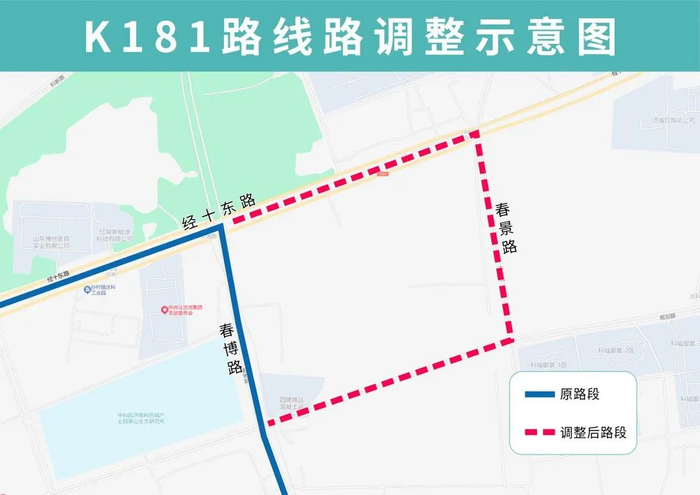 K181路优化调整后沿经十东路向东、春景路向南、规划路向西至春博路向南恢复原线,沿途增设科城御景、春博路南段站点。