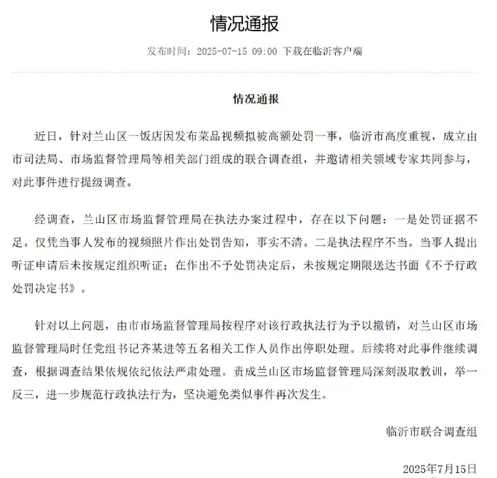 【餐馆老板发菜品视频拟被罚45万,官方通报:撤销处罚,5人停职】7月15日,临沂市联合调查组就拍摄发布菜品视频被高额处罚事件发布情况通报: