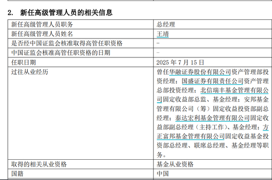 王靖,曾任华融证券资管部投资经理、国盛资管总部投资经理,北信瑞丰固收总监、安邦基金固收投资部副总、泰达宏利固收副总,方正富邦固收投资部总经理。