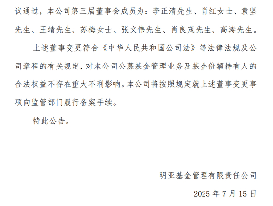 值得注意的是,明亚基金最近频繁进行人事变更,王靖则是7月15日刚刚纳入董事会成员,丁玥则除名,2025年5月31日的时候还没有王靖的名字。而且,明亚基金1年内董事变更已超过50%。