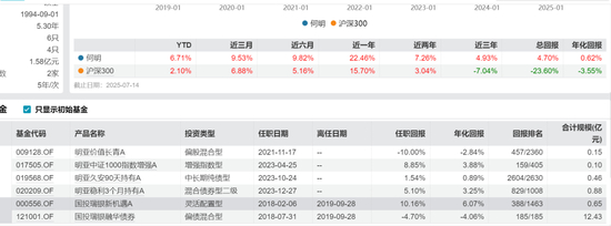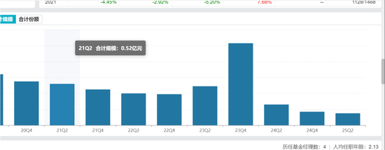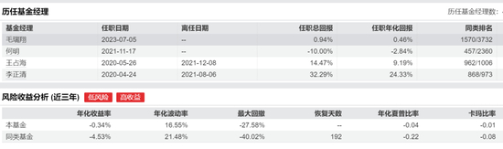 这款基金成立5年,但换了三波基金经理。看起来个人任职回报都挺好,只有何明管理的21年回撤10%,但规模则大幅缩水,只有1500万了。