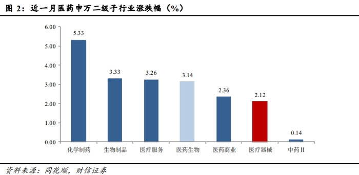 近一月(统计期间为2025年6月7日—2025年7月7日),医药生物(申万)板块涨跌幅为3.14%,在申万31个一级行业中排名第15位,分别跑赢沪深300、上证指数、深证成指0.79、0.55、0.67个百分点,跑输创业板指1.31个百分点;医疗器械(申万)板块涨跌幅为2.12%,在6个申万医药二级子行业中排名第5位,分别跑输医药生物(申万)、沪深300指数1.02、0.23个百分点。