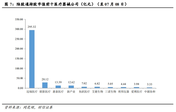 近一月,医疗器械行业市场成交额占医药生物总成交额比例为14.56%,医药行业公募机构持股2380.64亿元,其中医疗器械持股619.25亿元,占比为26.01%。个股方面,医疗器械板块持股市值前十名分别为迈瑞医疗、联影医疗、惠泰医疗、新产业、鱼跃医疗、艾德生物、三诺生物、理邦仪器、爱博医疗、中源协和。