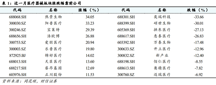 近一月板块内标的涨跌幅排名靠前的个股有热景生物(34.05%)、阳普医疗(33.23%)、宝莱特(29.39%)、浩欧博(26.88%)、爱朋医疗(20.94%);涨跌幅排名靠后的个股有奕瑞科技(-33.66%)、硕世生物(-30.01%)、拱东医疗(-27.13%)、惠泰医疗(-26.83%)、万泰生物(-17.48%)。