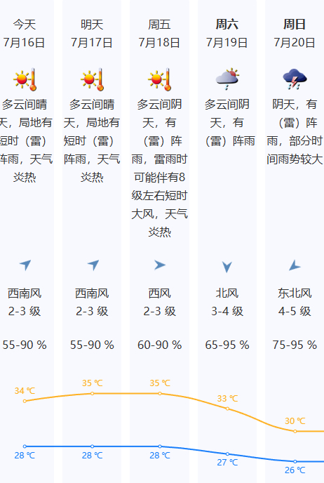 7月16日~18日,深圳市多云间晴天,局地有短时(雷)阵雨,天气炎热,其中16日气温28℃~34℃,中北部及人口密集区最高气温35℃或以上;