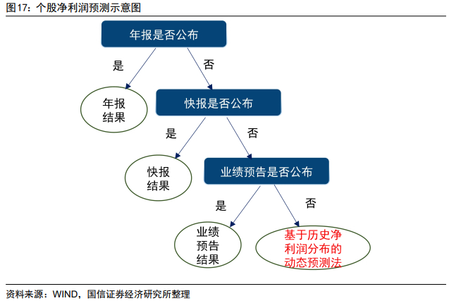 在计算个股的年度净利润数据时,若该公司已公布年报、快报或业绩预告数据,那么我们直接采用已公布的归母净利润数据作为其年度利润数据,其中业绩预告数据取上下限均值进行代替。若公司尚未披露相关报告,那么需要对其年度利润进行估计。