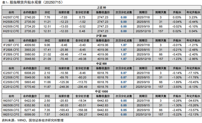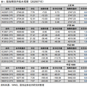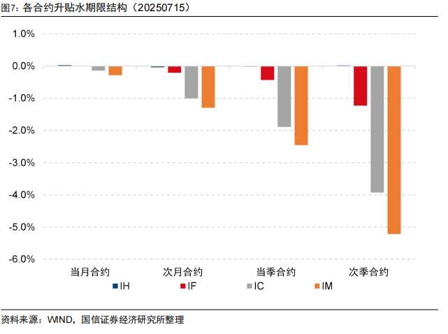 截至2025年7月15日,IH主力合约年化贴水0.44%,IF主力合约年化贴水2.48%,IC主力合约年化贴水11.78%,IM主力合约年化贴水15.26%。