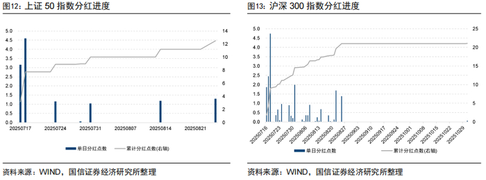 为了更加详细地展示各指数的分红进度,图12-图15分别展示了上证50指数、沪深300指数、中证500指数和中证1000指数的预测分红进度,可以看到成分股分红基本分布在8月。