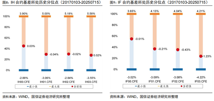 图7展示了各合约升贴水期限结构,总体来看随着标的指数覆盖的市值区间变小,股指期货的贴水幅度越深。
