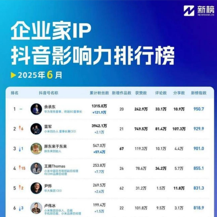 近日,新榜发布2025年6月企业家IP抖音影响力榜单。引发了“谁是抖音最火企业家”这一话题。新榜基于大数据统计能力,以粉丝数、粉丝增量、分享数、评论数、点赞数等多个维度进行综合统计,清晰呈现了企业家们在抖音的影响力排行。拥有全网粉丝数量最多的雷军并未登顶,榜单排名第一的是华为常务董事、终端BG董事长余承东。