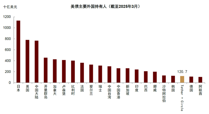 在此背景下,美国希望将稳定币与美债“绑定”,以此来提升对美债的需求。ARK的研究显示,稳定币的发行机构在过去几年已经积累了大规模的美债头寸[12]。截至2025年3月,Tether报告其持有的美债规模已达980亿美元,Circle也持有超过220亿美元的美债。Tether与Circle合计已持有超过1200亿美元的美债,相当于全球第18大美债持有国——略低于韩国但已超过德国。如果进一步观察2024年的美债购买数据,Tether是当年美债的第七大买家,仅排在英国和新加坡之后。此外,根据CoinMarketCap的数据[13],目前稳定币市值约为2560亿美元,到2028年,有望达到2万亿美元。The Global Treasurer估计,按当前主流的储备资产结构,这可能带来约1.2万亿至1.6万亿美元的美债需求,届时稳定币发行机构或将成为仅次于美联储的美国国债第二大买家[14]。