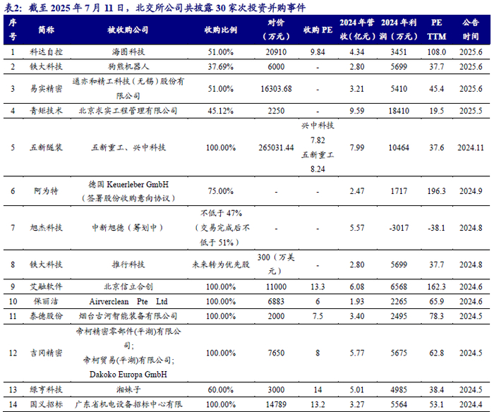 从新“国九条”到“并购六条”,2024年起,并购重组市场迎来了诸多积极信号。产业整合、跨界并购,为产业发展注入了新的动力。此外,地方国资成立并购基金的步伐也在加快,交易设计方面的创新层出不穷,上市公司亦借助并购重组的力量积极拓展国际市场。定位为主要服务创新型中小企业的北交所,能够及时把握并购机遇。我们认为,在北交所公司并购的趋势方向上,应重点关注:(1)同一集团内优质资源整合;(2)新质生产力行业外延并购;(3)“强链补链”扩张版图式并购。截至2025年7月11日,北交所共发生30家次重要投资并购事件。