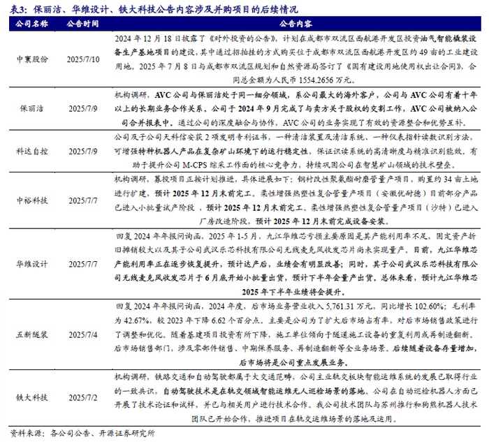 本双周(2025.6.30~2025.7.13),已公告投资并购事件的公司发布的以下公告值得关注。其中保丽洁、华维设计、铁大科技分别介绍了其收并购的AVC公司、九江华维芯、苏州推行和狗熊机器人的业务开展与协同整合情况。