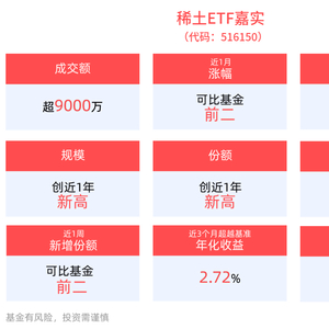 规模方面,稀土ETF嘉实最新规模达27.64亿元,创近1年新高,位居可比基金第一。份额方面,稀土ETF嘉实最新份额达21.93亿份,创近1年新高,位居可比基金第一。资金流入方面,稀土ETF嘉实最新资金净流入1.55亿元。