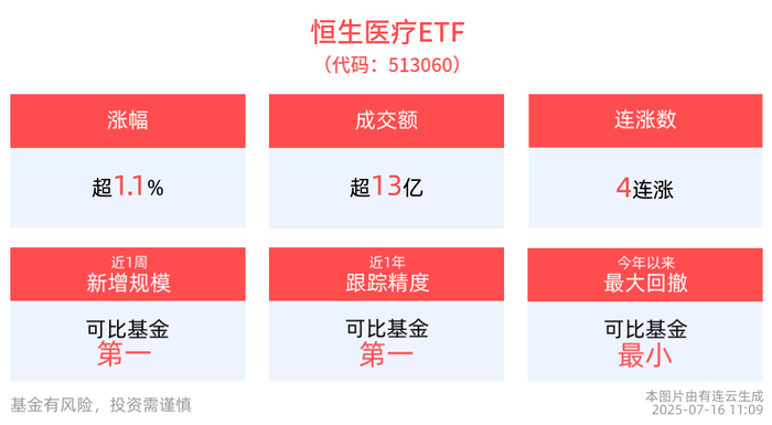 创新药行情持续火热,恒生医疗ETF(513060)涨超1%冲击4连涨,近1周新增规模居同类第一