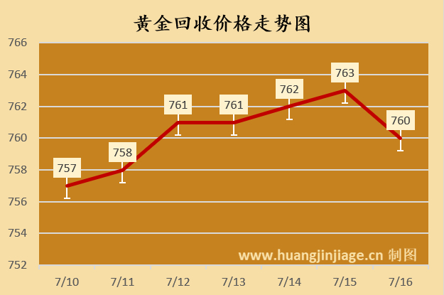 今日黄金回收价格每克760元,铂金回收价格每克291元,钯金回收价格每克242元,18K金回收价格每克547元,白银回收价格每克6.5元。(黄金行情是波动的,以结算价格为准。)