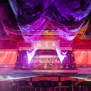 被誉为“中式浪漫天花板”的凝晖路,被精心还原为动画《天官赐福》中的极乐坊。豫园老街与《时光代理人》以“时光穿梭”为纽带,将动画叙事与现实空间紧密缝合。九曲桥畔,《百妖谱》的百夭桃树、《牧神记》的大墟秘境、《雾山五行》的泼墨山水与《天官赐福》的明灯三千在激光雾森中流转成灵动画卷,缔造出令人屏息的东方幻想世界。