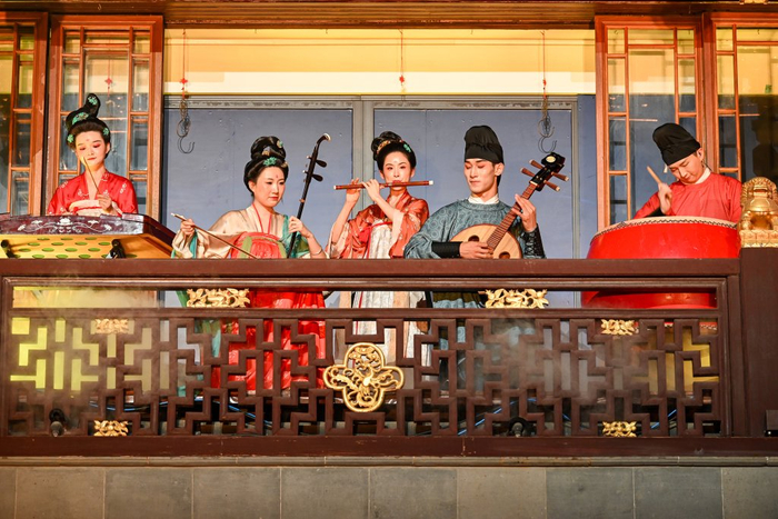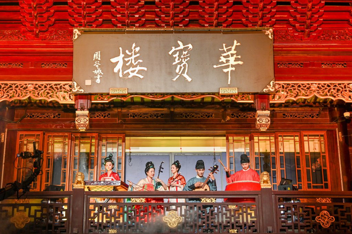 2025年7月15日,上海豫园,UP主二十四伎乐国风乐团奏响《天官赐福》经典《花满城》《一花一剑》。澎湃新闻记者 朱伟辉 图