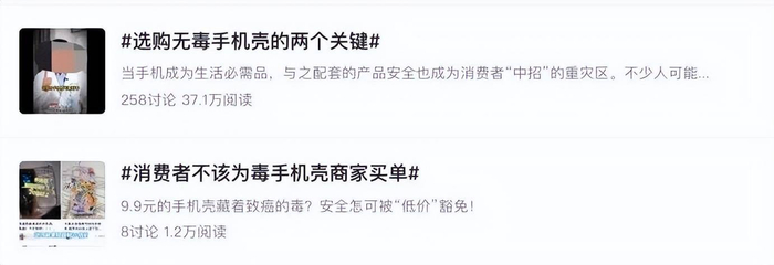 网上搜 “ 手机壳 ” 热搜关键词,各种 “ 重金属炸弹 ” 、“ 甲醛释放器 ” 等等翻车的案例都有。