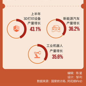 统计显示,上半年以高技术制造业为引领的相关产业继续保持高速增长——规模以上高技术制造业增加值增长9.5%,高端装备出口增长超两成,3D打印设备、新能源汽车、工业机器人产品产量同比分别增长43.1%、36.2%、35.6%,锂电池产量增长达53.3%,数字经济核心产业增加值占GDP比重达到10%左右——这些都成为上半年经济运行比较显著的亮点。