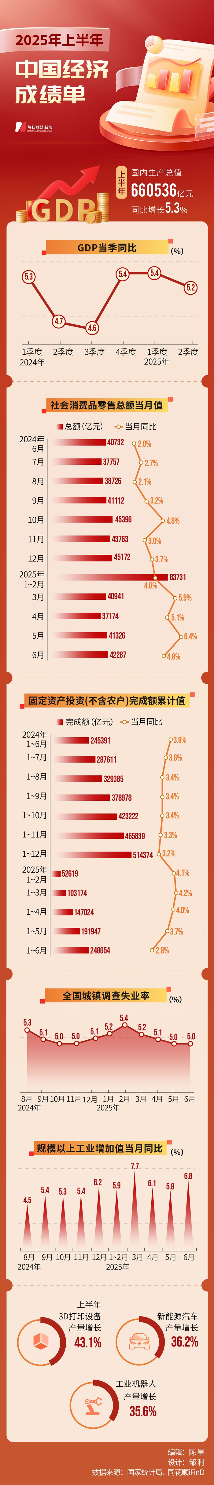 7月15日,国家统计局公布上半年国民经济数据。初步核算,上半年国内生产总值660536亿元,按不变价格计算,同比增长5.3%。