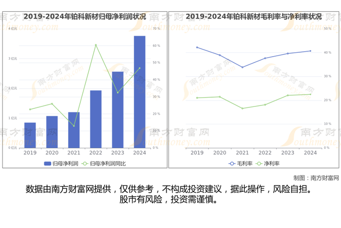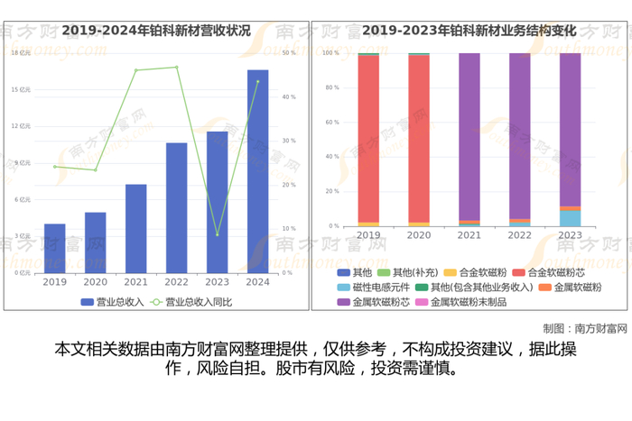 铂科新材年报数据显示(如上图),2024年实现营业总收入16.63亿,同比增长43.54%,近5年复合年增长率35.26%。