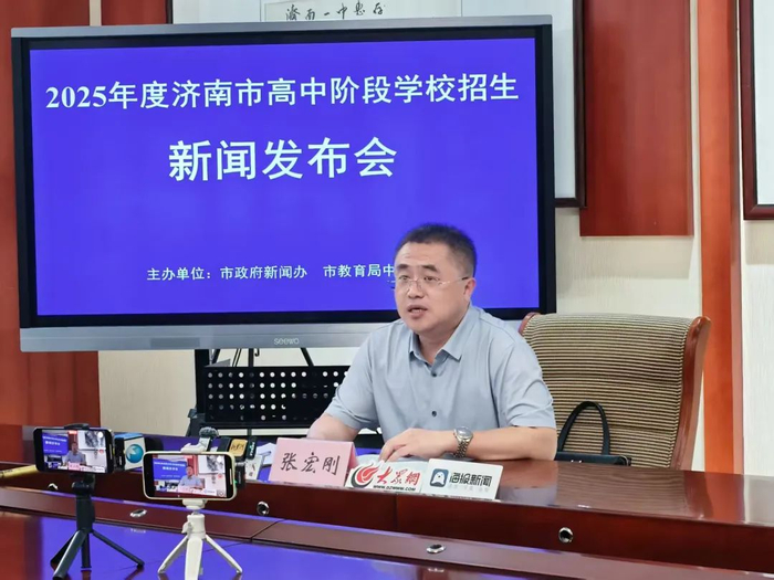 2025年7月15日,全市高中阶段学校招生工作第二次新闻发布会在济南一中图书馆会议室召开。本次新闻发布会由济南市政府新闻办公室、济南市教育局中招办主办,济南市教育局党组成员、副局长方奎明参加新闻发布会,并回答记者提问;济南市教育招生考试院院长张宏刚参加新闻发布会。