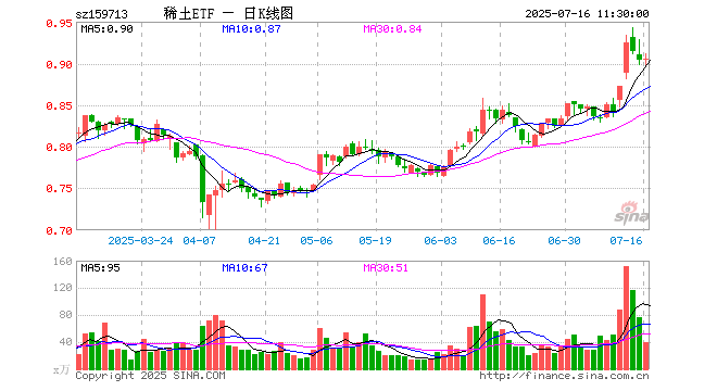 7月16日,截止午间收盘,稀土ETF(159713)涨0.11%,报0.905元,成交额3589.26万元。稀土ETF(159713)重仓股方面,北方稀土截止午盘涨0.45%,卧龙电驱涨1.21%,中国稀土涨0.87%,领益智造涨0.77%,中国铝业跌0.56%,格林美涨0.00%,厦门钨业涨1.11%,包钢股份跌1.48%,金风科技跌0.31%,盛和资源涨6.03%。