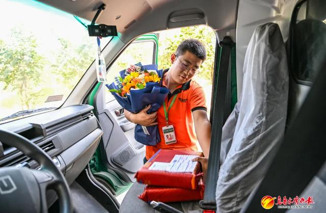 7月15日,在中国邮政集团有限公司乌鲁木齐市分公司白鸟湖揽投部,快递员蒋丽军带着鲜花和高考录取通知书,准备前往约定地点为考生投送。