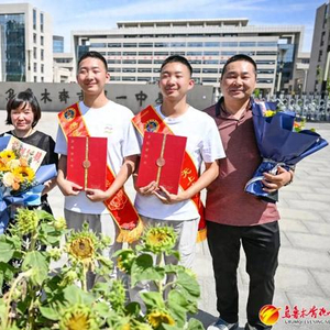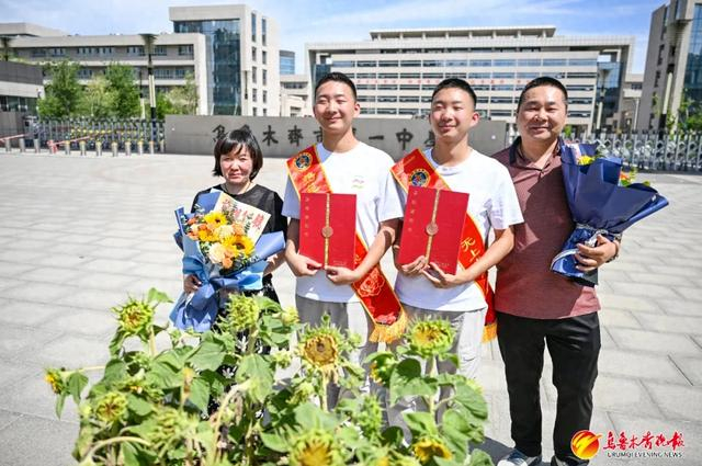 7月15日,在乌鲁木齐市第一中学门口,快递员蒋丽军将来自国防科技大学的高考录取通知书,送至双胞胎兄弟成有智和成有翔手中。