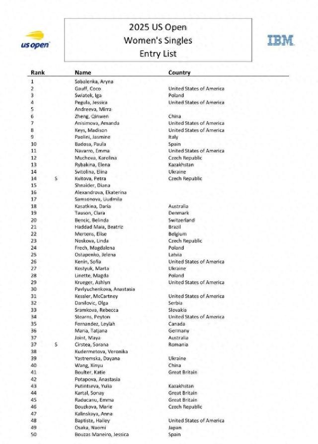 2025年美国网球公开赛正赛入围名单出炉,包括多名中国选手。
