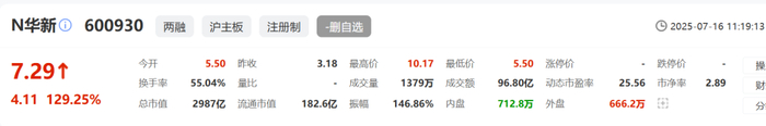 发行价格3.18元/股,开盘价格5.50元/股,截至11:19,股价7.29元/股,涨幅129%,总市值2987亿元。