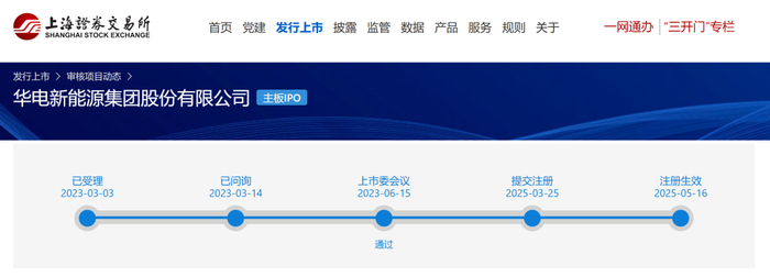 华电新能此番上市,于2023年3月3日获上海证券交易所受理,2025年5月16日注册生效,2025年7月16日正式上市交易,共历时约2年4个月。
