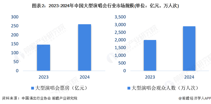 近年来,在居民消费能力水平不断提高的背景下,我国演唱会市场规模波动增长。据中国演出行业协会统计数据,2024年国内大型演唱会票房突破260亿,同比增长78.1%,下半年进入开演热潮;观众人数超过2900万人次,同比增长45.0%,成为演出市场票房成绩最为突出的品类。