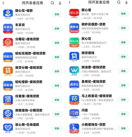 除了随心花,随心借等多个同开发者应用也均存在投诉。综合来看,这些APP普遍存在随意搜集个人信息、强行下款、高利贷等乱象。