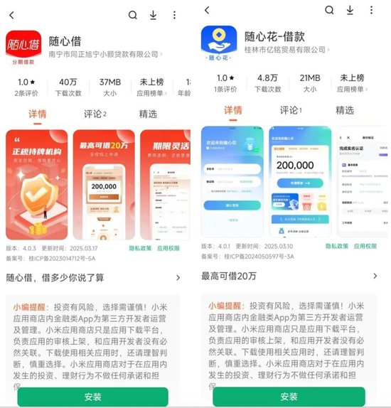 然而,桂林亿铭贸易也注册了多个贷款APP平台,小米应用商城显示,桂林亿铭贸易主体运营的APP有9个,其中随心花的下载量高达5万,另外,随心花在华为商城的下载量也达到9.3万。