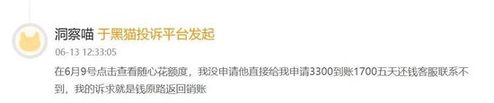 另一位网友称,6月9号只是点击查看随心花额度,并未申请贷款,平台便直接给申请了3300元贷款,到账1700元,五天后还钱,网友想找客服处理,却联系不到客服。