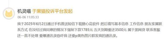 有网友表示,今年6月2日通过手机推送短信下载随心花软件,填写基本信息、工作信息、朋友家属联系方式后,在未经同意的情况下强制下款1785元,五天到期要还3500元,属于黑网贷,联系客服还一直不处理 ,还爆通讯录恐吓。