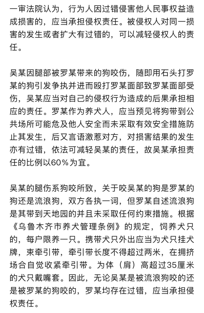 乌鲁木齐一女子带6只狗入公园,男子被狗咬打伤女子 法院判男子承担60%责任