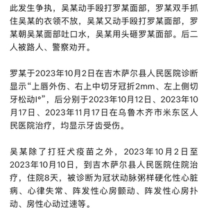 乌鲁木齐女子罗某与其女带6只狗逛公园,男子吴某在罗某前方不远处打电话,发现腿部被狗咬了就捡起石头打狗,罗某与吴某因此发生争执。随后,吴某打伤罗某牙齿和上唇。吴某除了注射狂犬疫苗之外,也在医院住院8天。