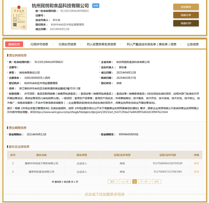 公开资料显示,杭州民悦和食品科技有限公司成立于2021-04-12,法定代表人为郭志春,注册资本为1000万元,统一社会信用代码为91330110MA2KFBRB2C,企业注册地址位于浙江省杭州市余杭区仓前街道欧美金融城2幢3510-1室,所属行业为科技推广和应用服务业。公司大股东为蓬莱民和食品有限公司,占股90%,蓬莱民和食品有限公司是上市公司民和股份(002234.SZ)的全资子公司,山东民和牧业股份有限公司前身是农业部山东蓬莱良种肉鸡示范场,始建于1985年改制于1997年,先后被认定为农业产业化国家重点龙头企业、全国农业标准化示范区、国家出口鸡肉标准化示范区、全国畜牧优秀企业、中国畜牧协会副会长单位。2008年5月16日,公司股票在深圳证券交易所成功挂牌上市,民和股份也成为国内白羽肉种鸡行业首家上市公司。