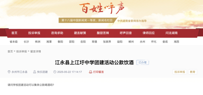 值得一提的是,今年5月,有多位网友在红网“百姓呼声”栏目对上江圩镇中学组织的团建提出质疑。