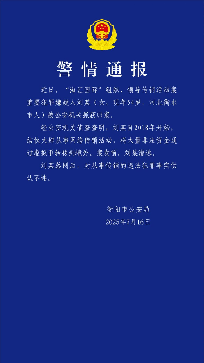 同日,衡阳市公安局发布警情通报称,“海汇国际”组织、领导传销活动案重要犯罪嫌疑人刘某(女,现年54岁,河北衡水市人)被抓获归案。